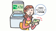 マークのある加盟店ならショッピングやお食事の代金をお客さまのキャッシュカードでお支払いいただけます。キャッシュカードをお店の方に渡してください。あとは暗証番号を入力するとお客さまの口座より、即時に決済いたします。